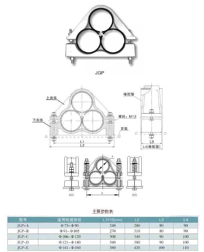 高压电缆由于技术原因常为单芯电缆,而单芯电缆单相运行中存在较大的阻抗,线损较大,一般建议将三根三相的单芯电缆按品字型排列以减少阻抗。因此电缆固定夹根据固定的电缆数分为单芯、三芯电缆固定夹。